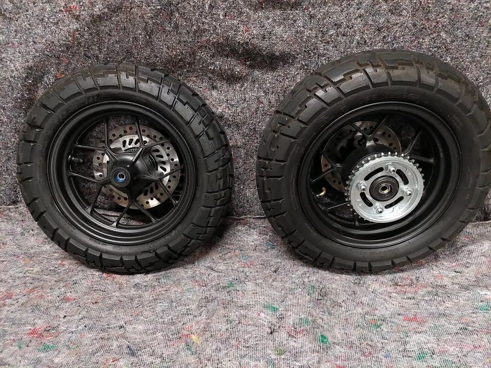 ADVENTURE MOTORCYCLE WHEELS are purpose-built to handle the extreme demands of mixed-terrain riding—where asphalt, gravel, sand, and rocky trails can all appear within a single journey. The wheel set shown in the image features robust rims fitted with aggressive dual-sport tires and heavy-duty brake discs , a configuration designed to balance on-road stability with confident off-road traction.