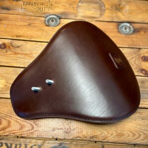 This custom motorcycle solo seat is crafted using high-quality leather combined with durable stitching and reinforced edging. The leather surface provides a rich, authentic feel that improves with age, developing a unique patina over time.