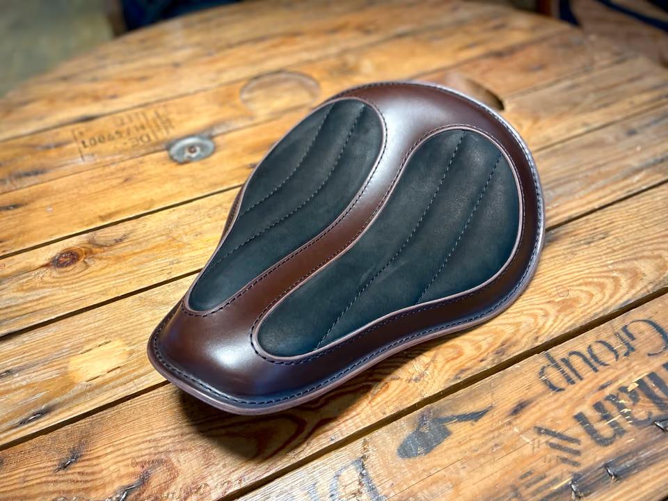 The contrast between smooth leather borders and textured seating panels gives the seat a luxury handcrafted look that fits perfectly with vintage and modern custom motorcycles.