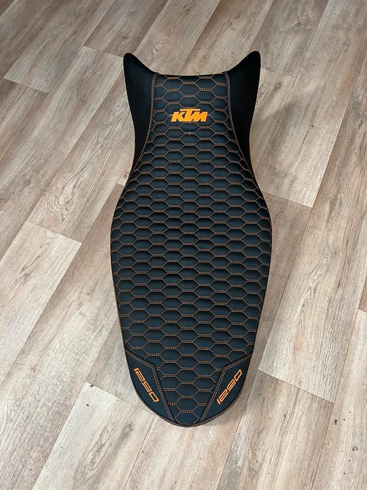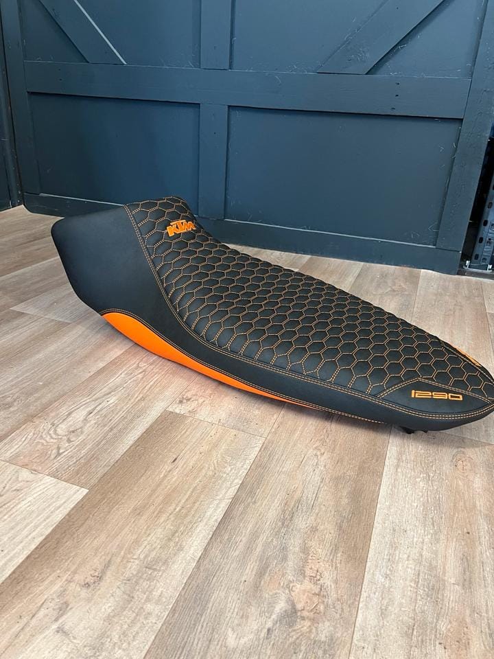 With its hex-pattern stitched surface, bold KTM branding, and signature orange accents, this seat enhances both the riding experience and the visual identity of your motorcycle.