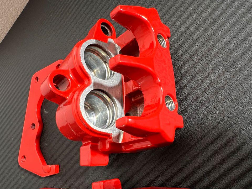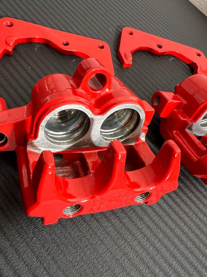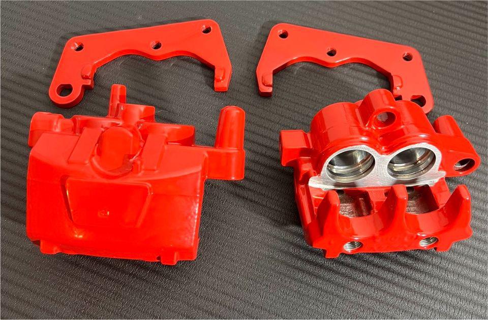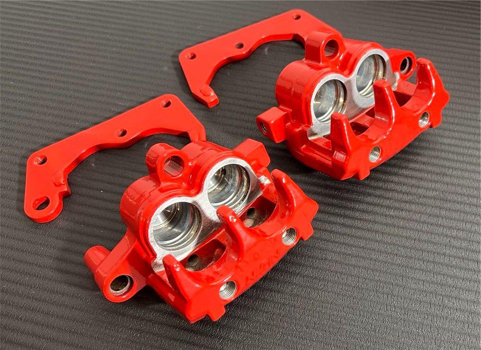 MOTORCYCLE BRAKE CALIPERS are one of the most critical components in any motorcycle braking system. They are responsible for converting hydraulic pressure into mechanical force, pressing the brake pads against the disc to slow or stop the motorcycle. The calipers shown in the image feature a dual-piston design with mounting brackets , finished in a bold red coating that reflects both performance intent and mechanical precision.