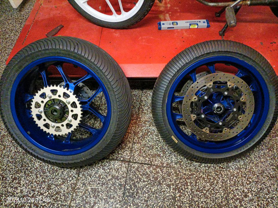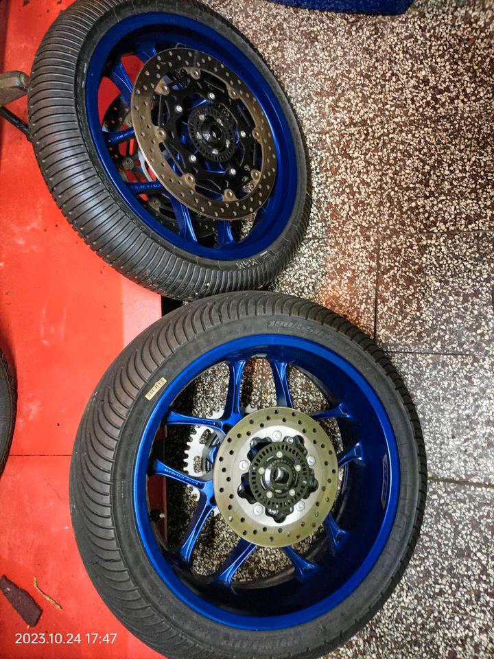 A MOTORCYCLE WHEEL SET is one of the most influential components affecting handling, stability, and overall riding confidence. The wheel set shown in the image features front and rear wheels fitted with road-performance tires, a front brake disc, and a rear sprocket , all mounted on striking blue alloy rims. This configuration is commonly found on modern sport motorcycles built for responsive road performance and agile cornering.