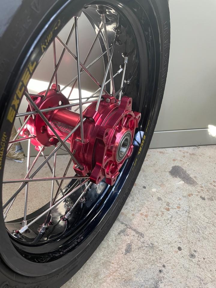Built with high-quality aluminum rims, reinforced stainless steel spokes, and precision-machined anodized hubs, these wheels are engineered to withstand extreme braking forces, rapid direction changes, and high-speed cornering typical of modern supermoto riding. Every component is selected to deliver confidence, durability, and performance in the most demanding riding conditions.